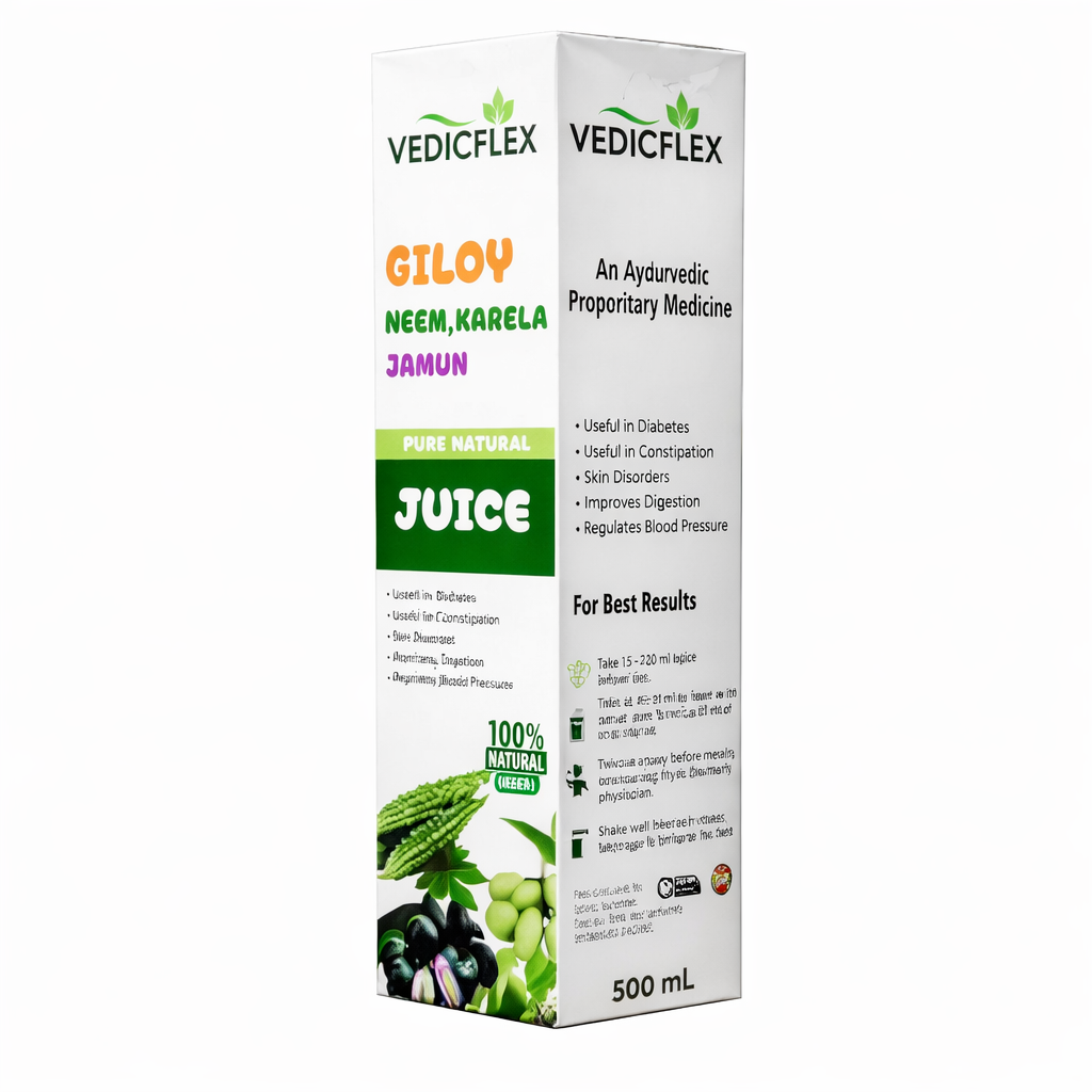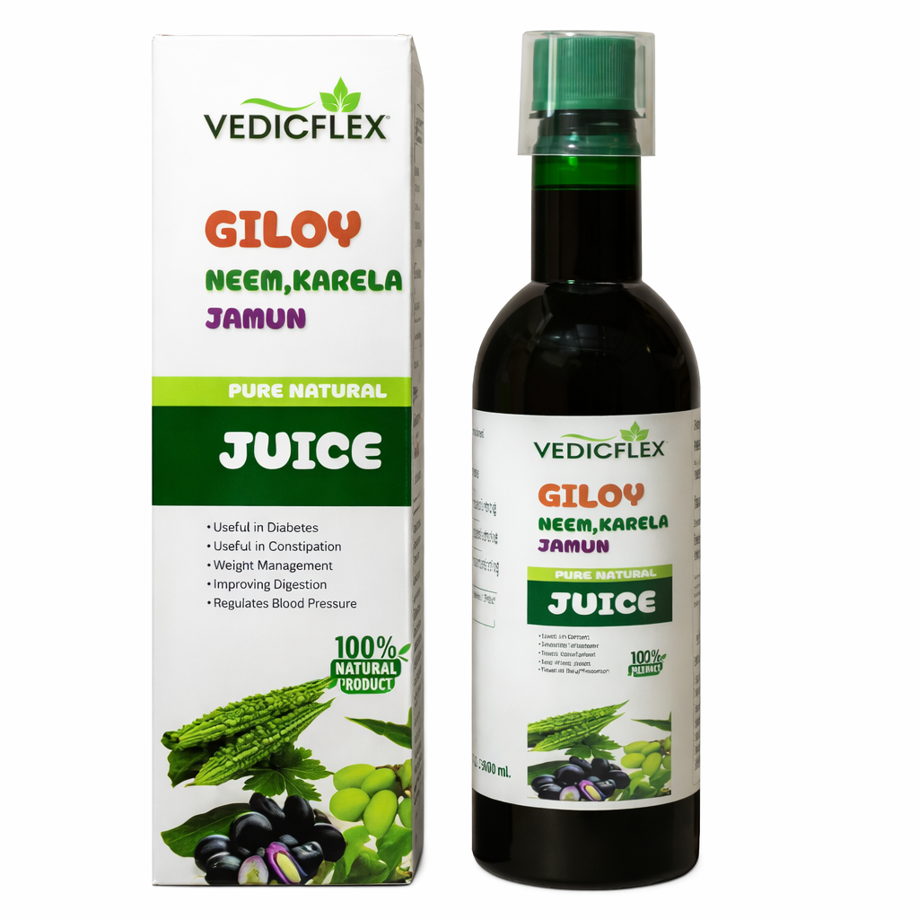 Vedicflex Giloy Neem Karela Jamun Juice is a 100% natural Ayurvedic herbal juice that supports immunity, blood sugar balance, and overall wellness